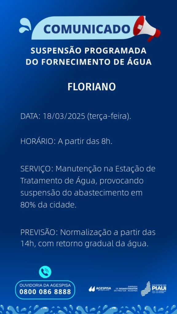 A Agespisa informou que o fornecimento de água será suspenso em Floriano na terça-feira, dia 18 de março, a partir das 8h, devido a uma manutenção programada na Estação de Tratamento de Água. A interrupção afetará aproximadamente 80% da cidade.