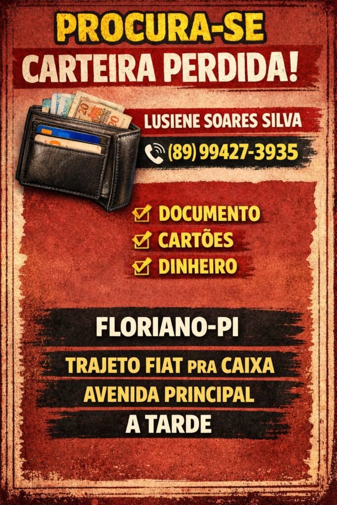 Uma carteira contendo documentos pessoais, cartões e dinheiro foi perdida na tarde desta terça-feira em Floriano, gerando mobilização da família para tentar recuperar o objeto.