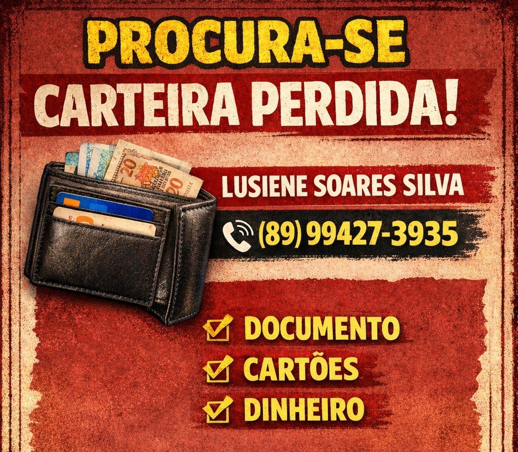 A proprietária, Lusiene Soares Silva, e a família disponibilizaram um telefone para contato de quem tiver qualquer informação sobre o paradeiro da carteira: (89) 99427-3935.