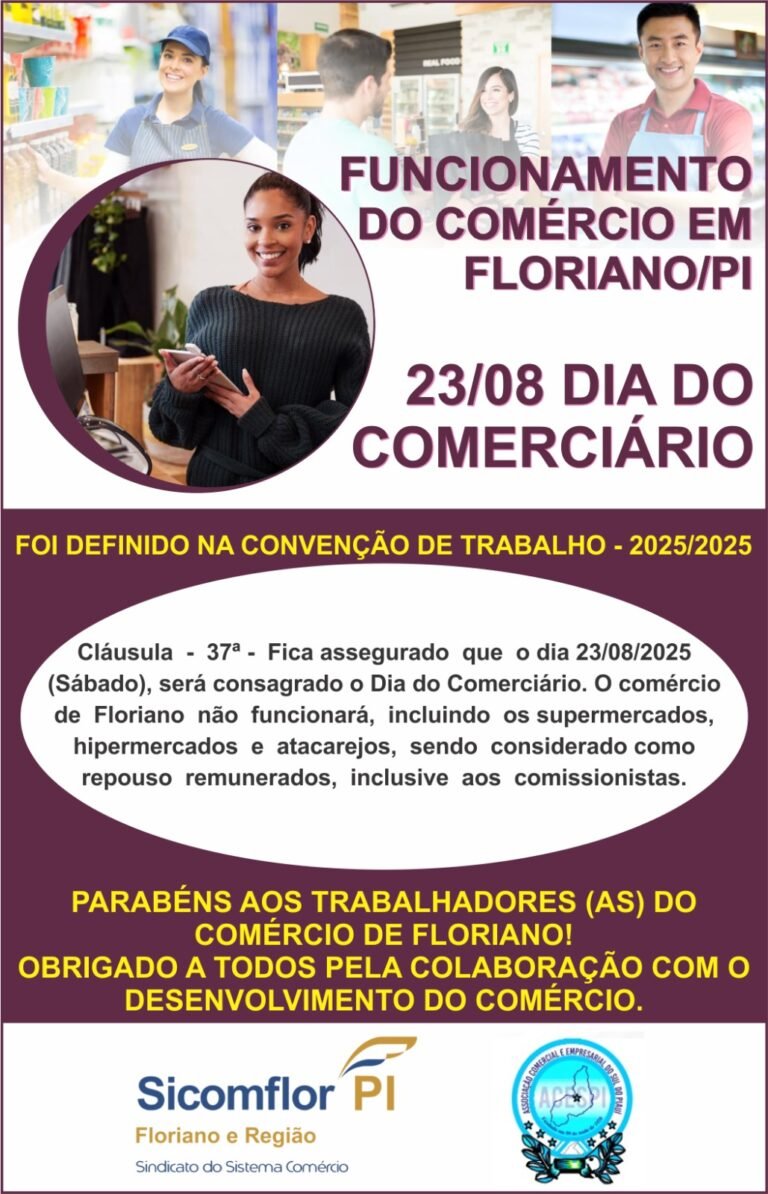 Comércio Comércio de Floriano funcionará em horário especial no sábado que antecede o Dia dos Pais, informa presidente do SICOMFLOR 7 de August de 2025 No Comments