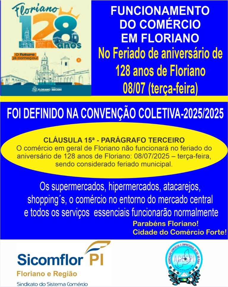 Comércio Comércio de Floriano terá funcionamento especial no feriado dos 128 anos da cidade 7 de July de 2025 No Comments