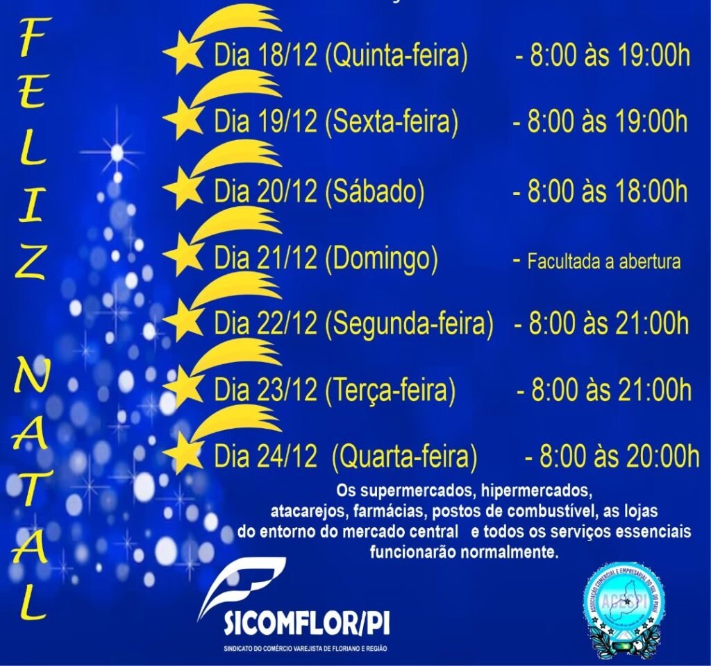 O Sindicato do Comércio de Floriano (SICOMFLOR) divulgou o horário especial de funcionamento do comércio para o período natalino, conforme explicou o presidente da entidade, Cunegundes Gonçalves. As orientações seguem o que foi definido na negociação da convenção coletiva firmada no início do ano, que regulamenta a atuação das empresas e a jornada dos trabalhadores durante o período de maior movimentação no varejo.