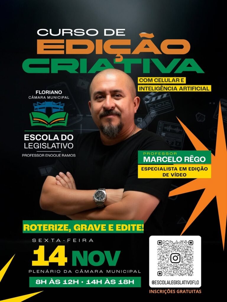 A Escola do Legislativo Vereador Professor Enoque Ramos, da Câmara Municipal de Floriano, está com inscrições abertas para o Curso de Edição Criativa com Celular e Inteligência Artificial, ministrado pelo professor Marcelo Rêgo, especialista em edição de vídeo.