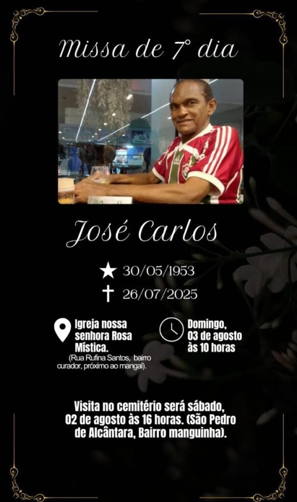 Será celebrada neste domingo, dia 03 de agosto, a missa de sétimo dia em memória de José Carlos, que faleceu no último dia 26 de julho aos 72 anos de idade. A celebração será realizada às 10h da manhã, na Igreja Nossa Senhora Rosa Mística, localizada na Rua Rufina Santos, bairro Curador, próximo ao Mangal, em Floriano.