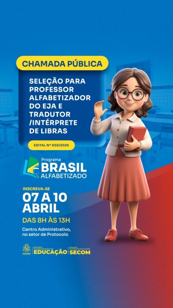 A Prefeitura de Floriano, através da Secretaria Municipal de Educação, tornou público, nesta quinta-feira, 3 de abril, o edital nº 002/2025 referente a chamada pública para seleção e composição de banco para professores alfabetizadores populares no âmbito do ‘Programa Brasil Alfabetizado’ (PBA).