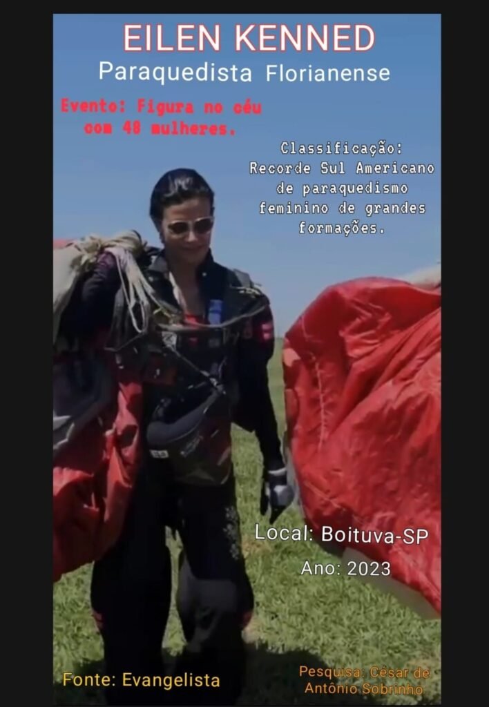 A paraquedista florianense Eilen Kenned destacou o objetivo de quebrar o recorde brasileiro e sul-americano feminino de paraquedismo em grandes formações no mês de março deste ano.