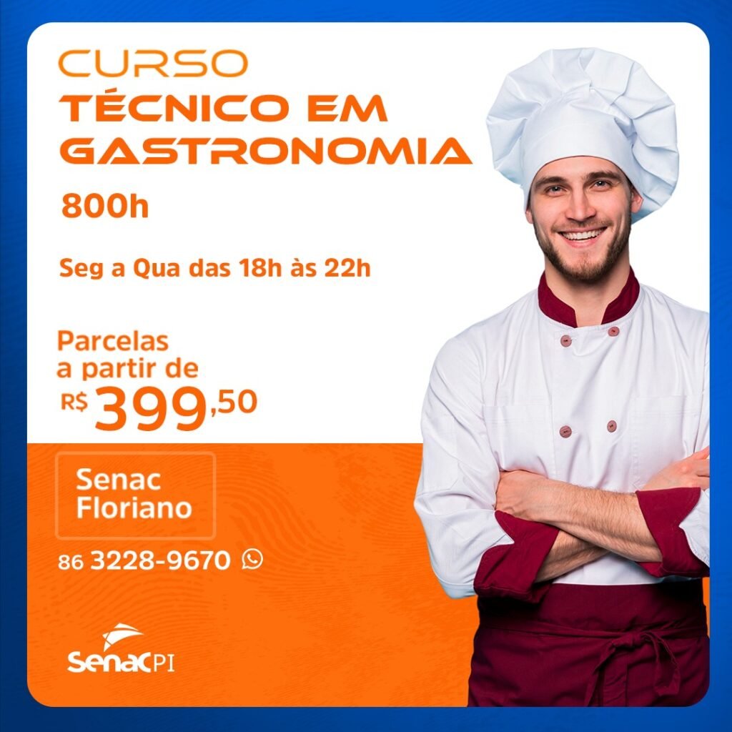 Além desse, o SENAC Floriano também está com inscrições abertas para o curso de Técnico em Gastronomia, que oferece uma formação sólida para quem busca uma carreira no setor de alimentos e bebidas, área que continua em expansão e com muitas oportunidades.